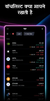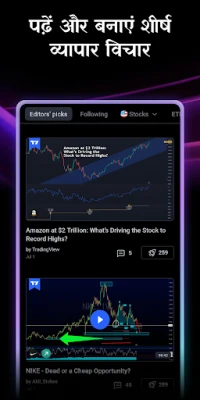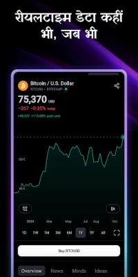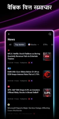 ट्रेडिंगव्यू दुनिया भर के लाखों व्यापारियों और निवेशकों के लिए आपका विश्वसनीय साथी है, जो आपको वित्तीय बाजारों की हर नब्ज से रूबरू कराता है। कहीं भी, कभी भी वास्तविक समय के उद्धरण और गहन चार्टिंग डेटा प्राप्त करें, जो सीधे पेशेवर प्रदाताओं से प्राप्त किए जाते हैं। स्टॉक, वायदा, लोकप्रिय सूचकांकों जैसे NASDAQ, S&P 500, NYSE, डॉव जोन्स, डैक्स, साथ ही विदेशी मुद्रा, बिटकॉइन और CFD तक व्यापक पहुंच का अनुभव करें। यह सिर्फ एक शक्तिशाली उपकरण ही नहीं, बल्कि एक जीवंत सामाजिक नेटवर्क भी है जहाँ आप वैश्विक निवेशकों के साथ जुड़ सकते हैं, नए व्यापारिक विचारों पर चर्चा कर सकते हैं और एक-दूसरे के अनुभवों से सीख सकते हैं।