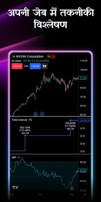 ट्रेडिंगव्यू उन्नत चार्टिंग के मामले में डेस्कटॉप ट्रेडिंग प्लेटफॉर्म को भी पीछे छोड़ देता है, जो गुणवत्ता और कार्यक्षमता में बेजोड़ है। हमारे ऐप में चार्ट की सभी सुविधाएँ, सेटिंग्स और उपकरण उपलब्ध हैं, बिना किसी समझौते के। बाजार विश्लेषण के लिए 10 से अधिक प्रकार के चार्ट का उपयोग करें, जिनमें साधारण लाइन चार्ट से लेकर रेनको और कागी जैसे विशेष चार्ट शामिल हैं जो समय के बजाय मूल्य उतार-चढ़ाव पर केंद्रित होते हैं, जिससे दीर्घकालिक रुझानों को पहचानना आसान हो जाता है। गान, इलियट वेव और मूविंग एवरेज जैसे संकेतकों, रणनीतियों और ड्राइंग ऑब्जेक्ट्स सहित विश्लेषण उपकरणों की एक विस्तृत श्रृंखला के साथ अपने विश्लेषण को और भी सटीक बनाएं।